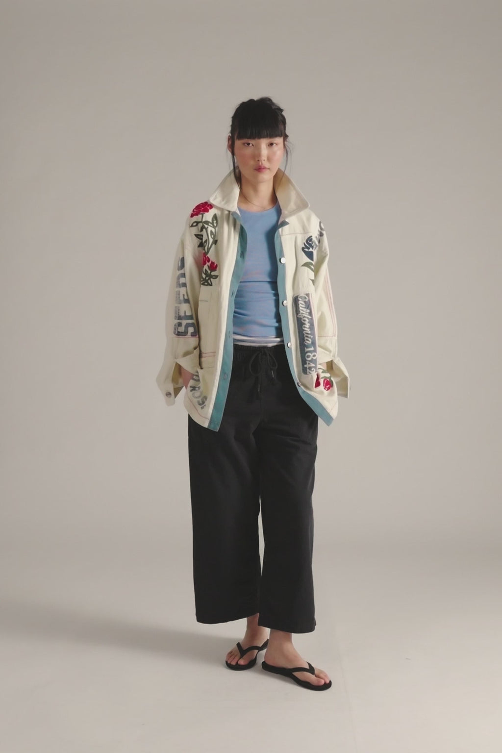 Features: Pull-on design with corded drawstring, oversized patch pockets, soft rigid denim