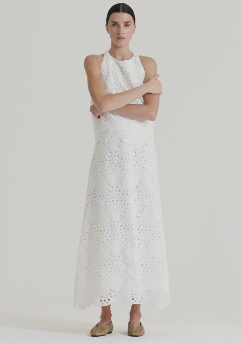 The Saffron Top is crafted from delicate cotton broderie anglaise and shaped with a timeless round neckline and a subtle keyhole button closure at the back. Its gently flared A-line silhouette offers easy elegance, while the scalloped hem and full lining complete the piece with refined detail.
